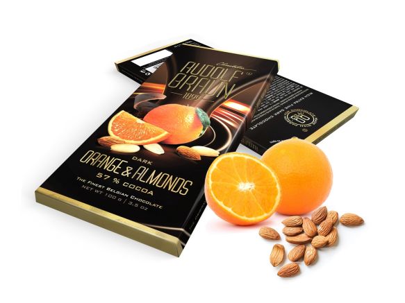 A rich, smooth dark Belgian chocolate with orange and almonds with a 57% cocoa content. Sweet pieces of orange in delicious dark chocolate give off a nice fragrance right after opening.