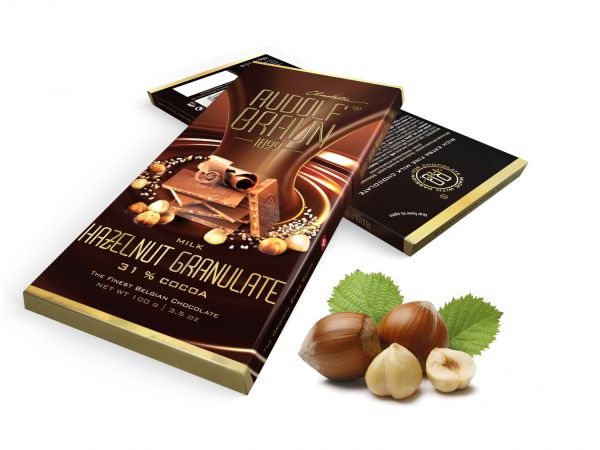 Rich extra fine Belgian milk chocolate with hazelnut pieces and 31 percent cocoa content.