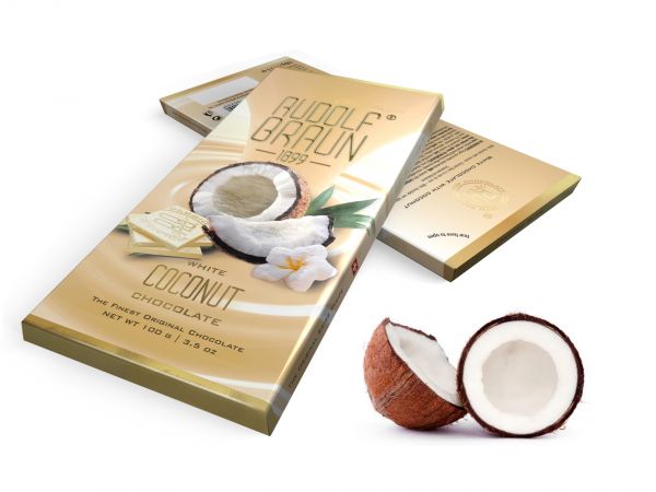 Rich extra-fine Belgian white chocolate with coconut and 27% cocoa.